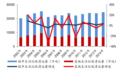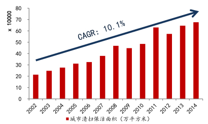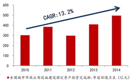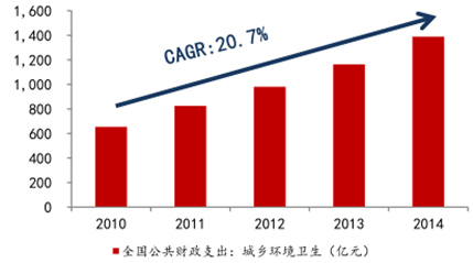 随着我国快速的城镇化发展, 政府在城乡基础建设和市容环境卫生方面的投入也在加大。2013 年城乡环境卫生建设的财政支出达到了 1000 亿元,并且过去三年的环境卫生支出增速都在 20%左右。我们预计未来随着城市化的发展,以及国家对环境保护的重视程度,城市垃圾清运和道路清扫的工作量会持续增长,同时对工作质量的要求也会上升,在量和价值双重提升下,行业投资将持续保持高增长。